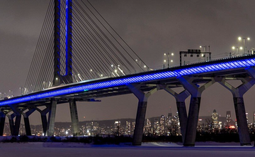 The Samuel De Champlain Bridge is lit in purple to commemorate the victims of the Tumbler Ridge Shooting on February 11, 2026, in Montreal, CanadaAndrej Ivanov/Getty Images